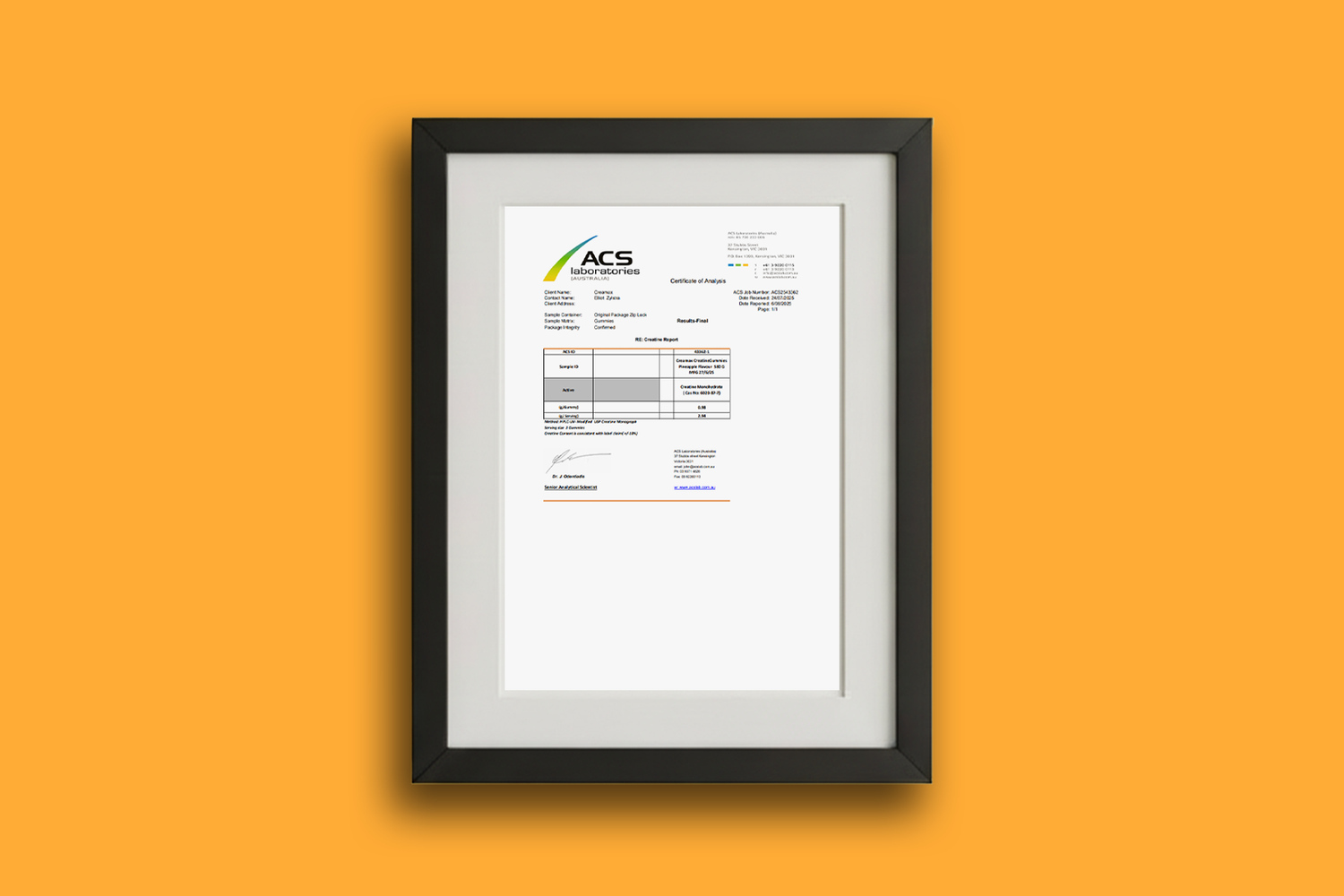 We test every batch of CreaMax with an independent lab down in Melbourne to verify creatine content. We publish these results publicly.